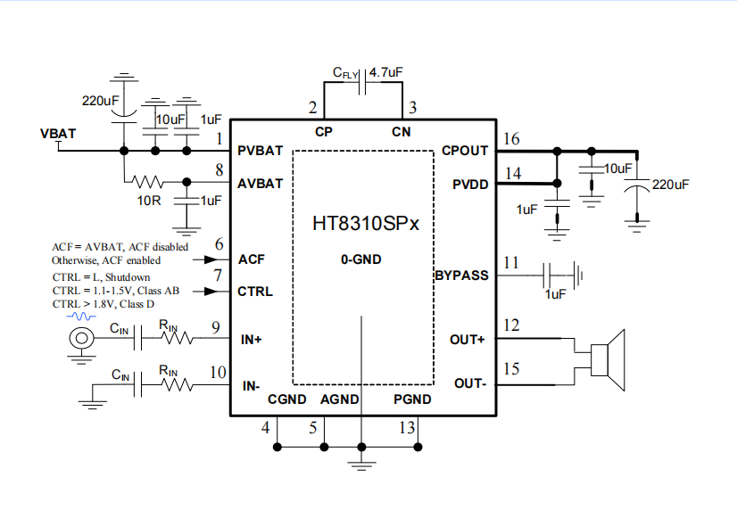此外,HT8310内部固定28dB增益,内置的关断功能使待机电流最小化,还集成了输出端过流保护、片内过温保护和电源欠压异常保护等功能。