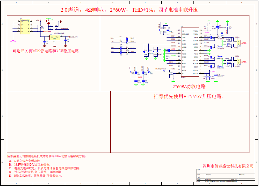 需要加散热片。推荐做2X50W的功率,供电电压选择DC 24V。外置升压芯片(配置HTN5157芯片,外挂MOS管,升压值24V)如要电池升压供电,推荐用HTN5157,设置160W的功率给功放芯片进行供电。