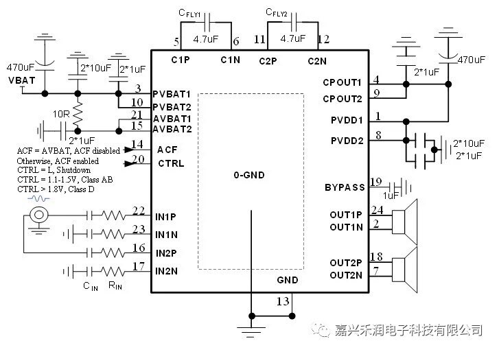 HT8320具有AB类和D类的自由切换功能,在受到D类功放EMI干扰困扰时,可随时切换至AB类音频功放模式(此时电荷泵升压功能关闭)。