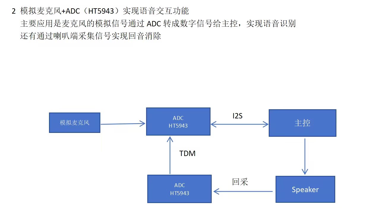 模拟麦克风采到信号,通过ADC(HT5943)转化为数字信号,在传给主控。主控处理后,直接推喇叭 或者 让功放放大后在推喇叭。 在用ADC(HT5943)进行信号回采与原信号比较,来消除回音。随着主控功能越来越强大,用ADC(HT5943)回采消除噪音的越来越少。