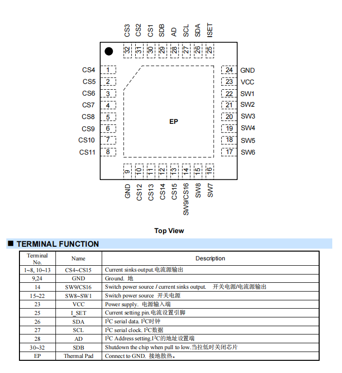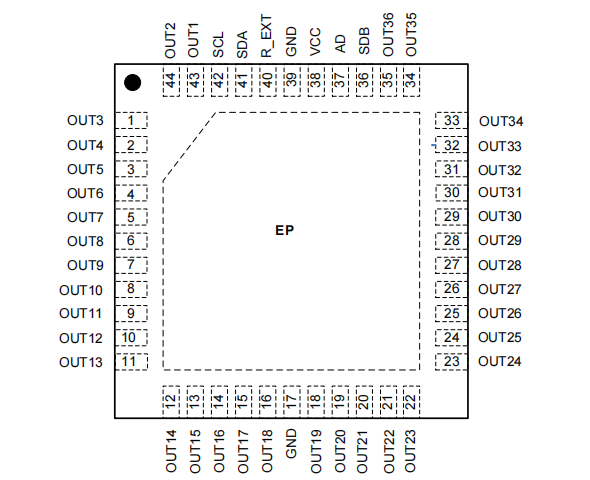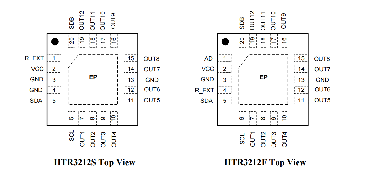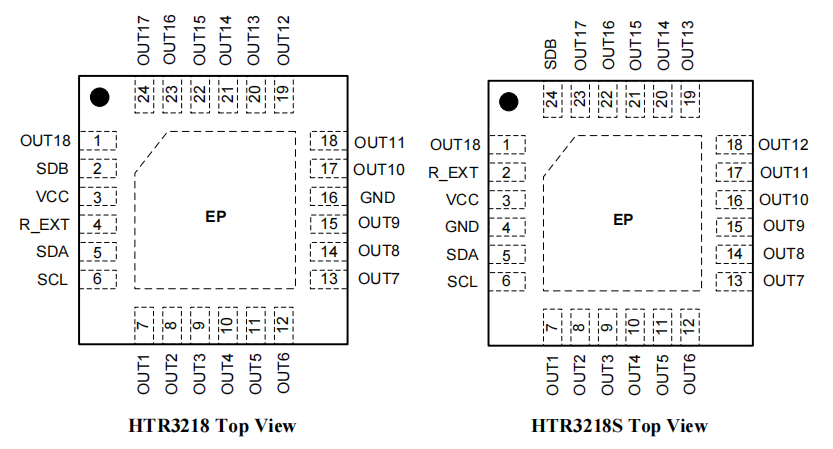 HTR3236是一款36路LEDPWM驱动器,PWM频率可固定为3kHz或22kHz。每一路最大输出电流可通过外置电阻RExT调节,最大38mA,并可独立控制4档可选。每一路可通过I2C单独控