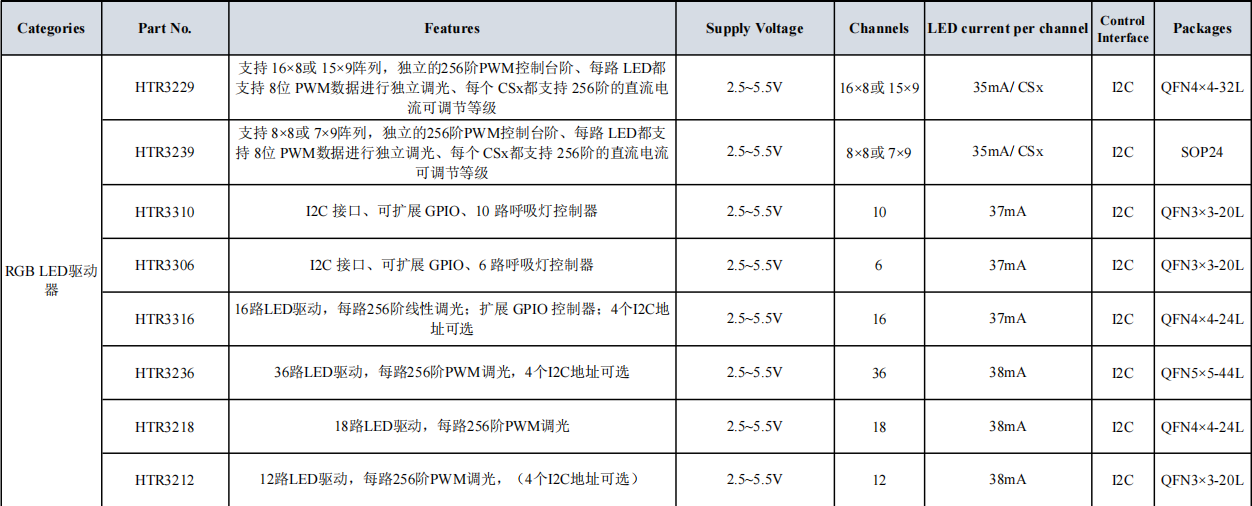 HTR3229替代IS31FL3729 HTR3310替代AW9110B HTR3306替代AW9106 HTR3316替代AW9523 HTR3236替代 IS31FL3236A SN3236 HTR3218替代SN3218 IS31FL3218 HTR3212替代SN3112 IS31FL3206