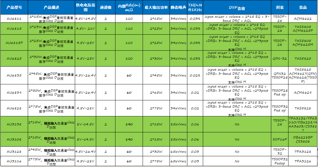 类比的数字功放产品,凭借其丰富的算法支持、低底噪和低失真特性,完美满足了市场对高品质音频产品设计的需求。与此同时,模拟功放产品则以其卓越的成本效益,满足了客户对成本敏感型应用的需求,尤其适合音箱、电视、投影仪等消费电子产品。