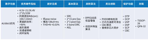AU68x5系列产品是类比推出的首个带DSP的中功率数字功放,专门为高端电视、中功率音箱、高端投影仪的应用设计。