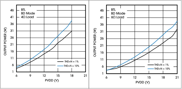 相比国际大厂同类功放,类比数字功放Rdson要小几十mΩ,有更大不失真功率和更高的效率(12V,1SPW,>90%)。对于音箱、声霸产品,常见18V供电、4Ω负载下,1%失真可以达到2*30W的大功率输出,轻松满足常见的2*20W的功率输出要求。对于电视投影仪产品,常见的12V、6Ω负载下,1%失真能够输出2*11W,满足6Ω8W/10W的功率要求。