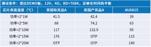 测试结果显示,在2*1W输出功率时,AU6815芯片的温度与市场上的竞争产品相当。然而,随着功率的提升,AU6815的优势逐渐显现。在2*10W输出时,AU6815的芯片表面温度显著低于竞品,分别低了22℃和37.9℃。当输出功率增至2*20W时,竞品芯片因温度过高触发了过温保护(OTP),而AU6815依然稳定运行。这表明,在相同功率条件下,AU6815的温升控制更为出色,从而为客户在设计时对PCB板层数、散热片规格以及铜皮厚度的选择提供了更大的灵活性和便利性。