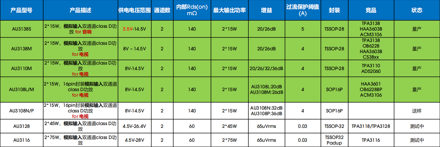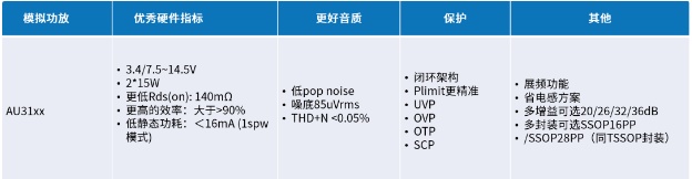 为满足低成本音箱市场的需求,类比半导体推出了具备3.5V至14.5V宽电压适用范围的模拟功放AU3138S(20/26dB)和AU3138T(32/36dB)。这些型号通过外部电阻配置,提供两档增益调节,全面覆盖了20/26/32/36dB的增益需求,确保了从单节电池到多节电池供电,乃至12V产品的广泛应用。