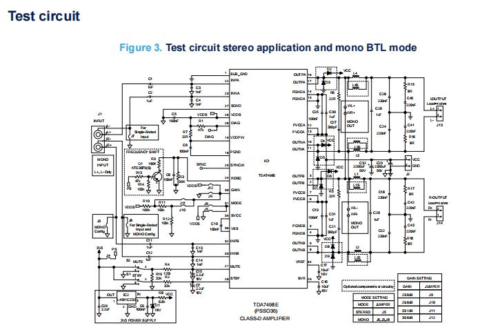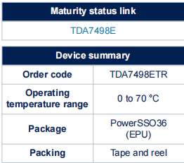 Description The TDA7498E is a dual BTL class-D audio amplifier with a single power supply designed for home systems and active speaker applications. It comes in a 36-pin PowerSSO package with exposed pad up (EPU) to facilitate mounting a separate heatsink.