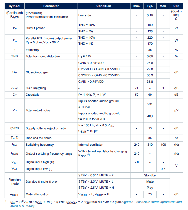 • 1 x 220 W output power mono parallel BTL at THD = 10% with RL = 3 Ω and