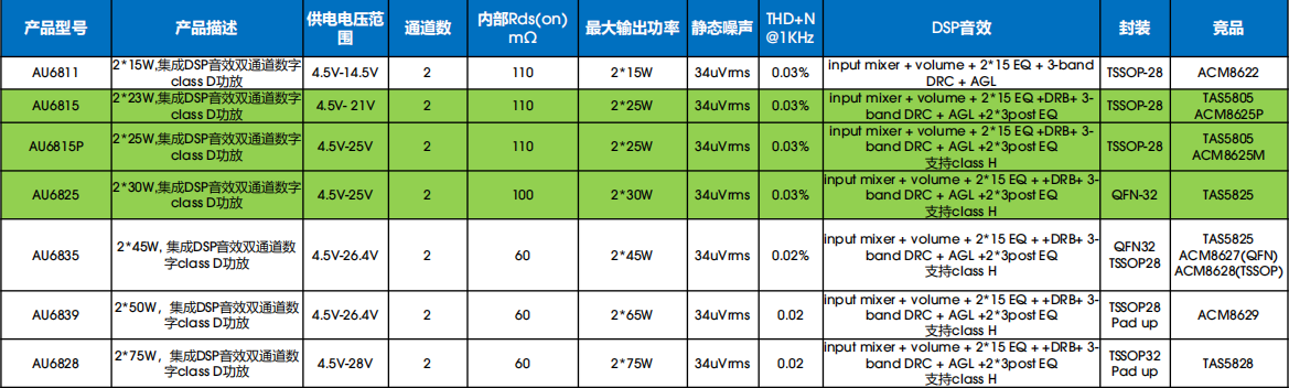 二、 AU6815、AU6815P、AU6825与TAS5805、TAS5825、ACM8625P、ACM8625M脚位兼容,可以根据电压与功率进行选择。