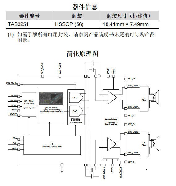 TAS3251 是一款数字输入高性能 D 类音频放大器,可实现真正的高端音质和 D 类效率。数字前端 采用 具有集成 DSP 的高性能 Burr-Brown™DAC,可实现高级音频处理,同时采用了 SmartAmp 和SmartEQ。该首款高功率单芯片解决方案降低了总体系统解决方案的尺寸和成本。DSP 由 TI PurePath™控制台图形调节软件提供支持,可以快速轻松地调节和控制扬声器。D类功率级 具有 高级集成式反馈和专有高速栅极驱动器错误校正功能,可以在音频频带内实现超低失真和噪声。该器件在 AD 模式下运行,最多可驱动 2 个175W/4Ω 负载和 2 个 220W/3Ω 负载。