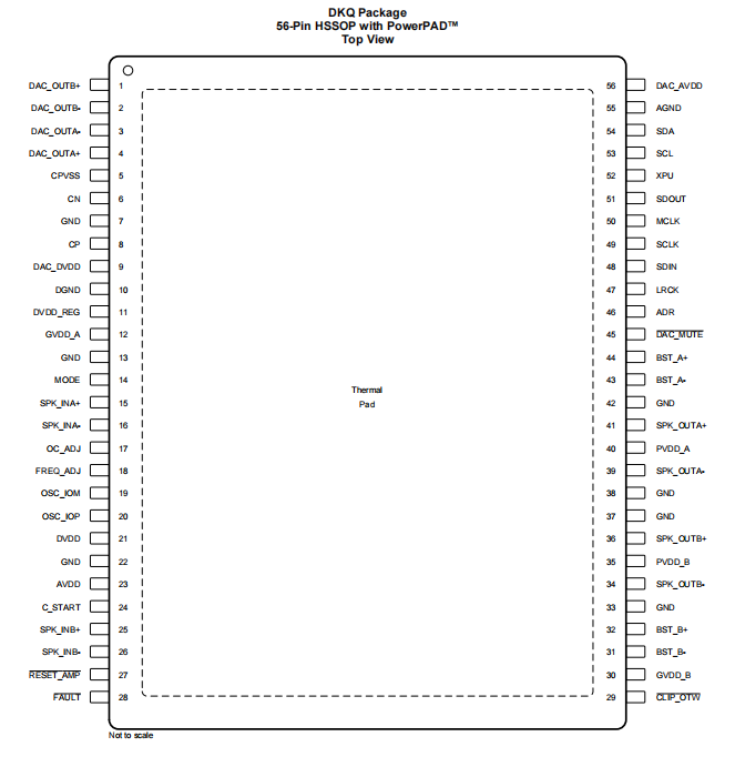 • 具有错误报告功能的集成式保护:欠压、逐周期电流限制、短路、削波检测、过热警告和关断以及直流扬声器保护