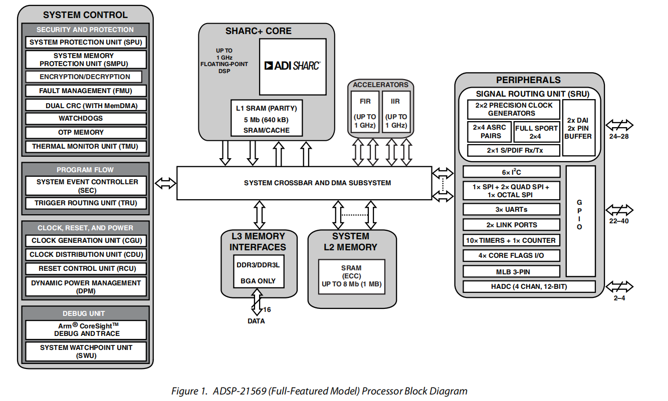 By integrating a rich set of industry-leading system peripheralsand memory (see Table 1), the SHARC+ processor is the platform of choice for applications that require programmability