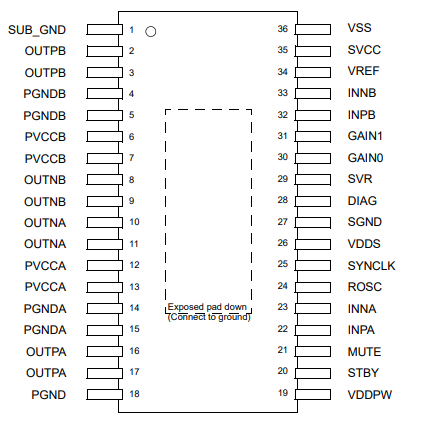 Features 25 W + 25 W continuous output power at THD = 10% with VCC = 20 V and RL = 8 Wide-range single-supply operation (8 - 26 V) High efficiency ( = 90%) Four selectable, fixed gain settings of nominally 21.6 dB, 27.6 dB, 31.1 dB and 33.6 dB Differential inputs minimize common-mode noise Standby and mute features Short-circuit protection Thermal overload protection Externally synchronizable ECOPACK®, environmentally-friendly package