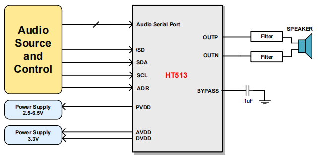 HT513内部集成了DA转换器,其12S输入最大支持32-bit字节,并且可自动监测采样频率,最高支持192kHz