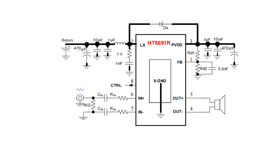 HT8691R内部集成免滤波器数字调制技术,能够直接驱动扬声器,并最大程度减小脉冲输出信号的失真和噪音。输出无需滤波网络,极少的外部元器件节省了系统空间和成本,是便携式应用的理想选择。