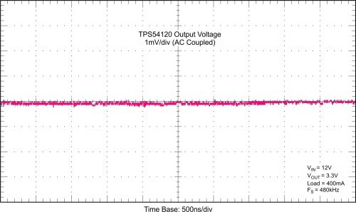 图3 通过一个LDO 供电的正弦波音频信号音频DAC 的FFT 图频谱分析和THD+N 测量结果 使用 LDO 低噪电源轨可以将声音品质提高约 8 dB。图 3 表明 THD+N 将超过 93 dB。另外,观察 FFT 频谱分析仪图后,我们发现,噪声底限得到极大降低。谐波很容易辨认,其取决于器件的性能。在其大部分频率带宽中,相比 –110 dBV,该噪声底限维持在 –120 dBV 以下(请参见图 2)。该结果证明,在音频转换器上使用一个低噪声电源轨可以提高性能。 相比转换器,LDO 电源解决方案拥有更加低噪的输出电压,但是线性稳压器的效率较低,并且会在系统中引起散热问题。因此,理想的解决方案是将转换器的高效率同线性稳压器的低噪声输出性能相结合,从而实现一种高效、低噪的电源解决方案。然而,在一些这两种因素都很重要的应用中,往往存在价格和空间限制。 在集成开关式转换器和 LDO 稳压器中,我们会发现一个集成转换器 +LDO 解决方案,例如:TPS54120。1A 开关式转换器与 LDO 组合使用,可向音频转换器高效地提供低噪电源。另外,这种集成解决方案还是一种低成本的解决方案,而占用的电路板空间也更少。它拥有优异的负载和线压瞬态响应性能,可在使用小型封装时承受很宽的输入电压范围,这让它成为家庭音频应用的理想选择。 使用集成开关式转换器和 LDO 稳压器代替第一个测量举例的转换器,可以得到更加低噪的输出电压(请参见图 4)。我们没有观测到输出电压噪声或者纹波。运用一个 12V 输入电压,并将输出调节为 3.3V。在 400 mA 负载电流时对受测输出电压进行测量。该电压可以完美地驱动整个音频系统,无需担心转换器的噪声和 AC 纹波。
