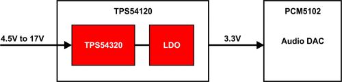 图 5 集成转换器和 LDO 稳压器供电音频 DAC 的示意图 表 1 对不同解决方案的成本、电路板空间、效率和性能进行了比较。我们发现,转换器 +LDO 的集成解决方案拥有高性能和高效率优势。 表 1 不同解决方案比较: IC成本面积效率性能转换开关中中高低LDO低低低高转换开关+滤波器高高高中转换开关 + LDO高高高高集成 SW +LDO中中高高 结论 开关式电源所产生的 AC 纹波和开关噪声会产生负面影响,其降低了音频 DAC 输出的质量。我们可以利用一些滤波技术,将音频转换器隔离于这些噪声源。除噪声以外,滤波器的效率、成本以及在音频系统中所占用的电路板空间,都是重要的因素。把开关式转换器的高效率与 LDO 的超低噪声性能相结合,是一种理想的解决方案。另外,由于成本和电路板空间占用得到进一步降低, 开关式转换器 +LDO 集成解决方案比独立解决方案更有优势。