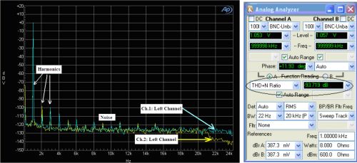 图 2 使用转换器供电的正弦波音频信号的 FFT 频谱分析图和 THD+N 测量 将开关噪声和纹波与 DAC 的电源轨隔离,可以实现更高的音频性能。给转换器输出添加额外滤波,可以帮助减少一定的噪声。但是,一些精密型滤波器过于豪华、复杂且占用空间更多。另外,大多数滤波器都存在功耗和负载调节问题,并且瞬态响应能力较差。利用一个线性稳压器 (LDO) 将 12V 输入总线转换为 3.3V,可以极大地减少纹波和噪声,从而达到更高的音频性能。使用 LDO 的缺点是设计的效率较低且功耗更高。 图 3 显示了通过一个 LDO 供电的音频 DAC 的 FFT 图。同前面的测试一样,我们给该 DAC 的光输入施加一个 1-KHz 正弦音频信号。测试条件与前面一样,并使用相同的音频精度测试设备作为测量工具,可得到如下 FFT 结果和 THD+N 测量情况。