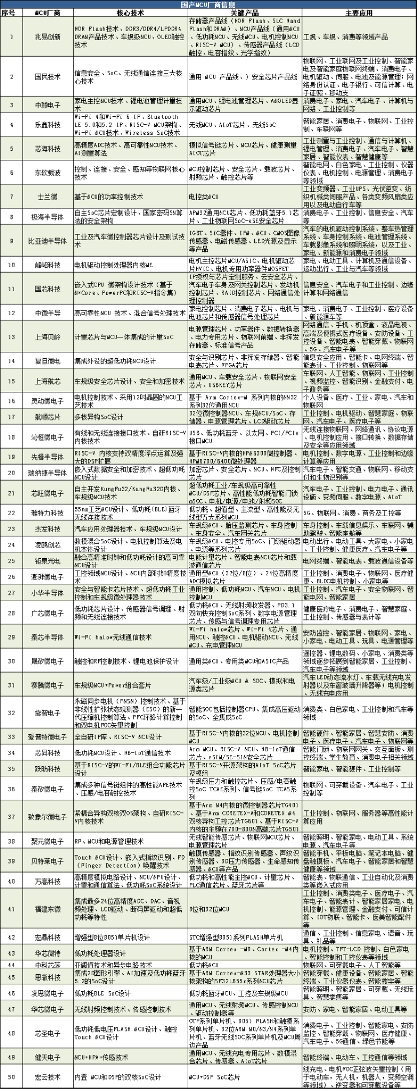 以下为笔者整理汇总的50家国产MCU企业及其核心技术和关键产品信息: