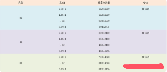 在显示系统中,2K、4K和8K代表的是不同尺寸的图像类别,每一种尺寸类别都有严格规定的像素点数量,从而实现不同的宽高比例。为规范和统一数字显示标准,为每个K值类别中的不同的宽高比定义了像素数,分别如下: