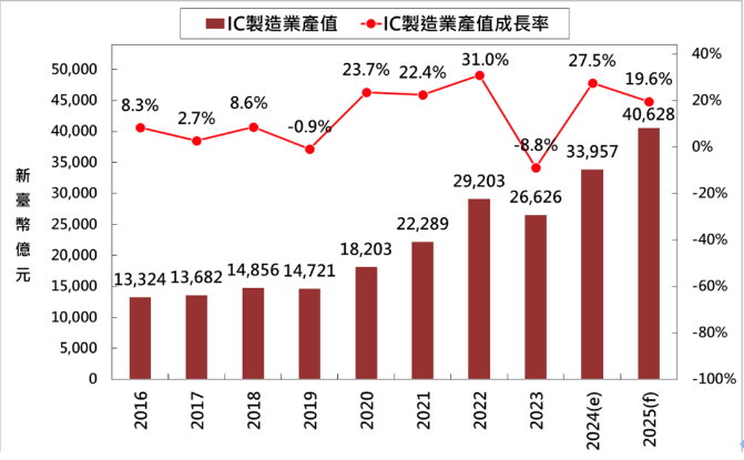 在工研院举办的「眺望2025 产业发展趋势研讨会」 上,IEK 产业分析师表示,2024 年中国台湾IC 产业产值正式突破5 兆元关卡,年成长预估达22%,高于全球市场平均水准。