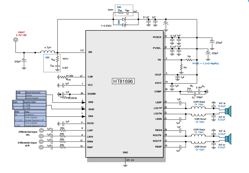 此外,HT81696内部集成免滤波器调制技术,能够直接驱动扬声器,内置的关断功能使待机电流最小化,还集成了输出端过流保护、片内过温保护、输入电源欠压异常保护、升压电压过压保护等功能。