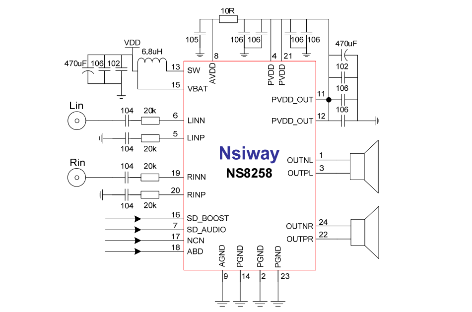 产片介绍:NS8258 是一款内部集成升压电路,超低噪声,防失真,无需滤波器,3W×2 双声道 AB 类 D类切换音频功放。在锂电池供电时,即使电池电压不断下降也能持续稳定的输出功率。NS8258 采用全差分输入设计,使得功放有较好的共模噪声抑制特性。