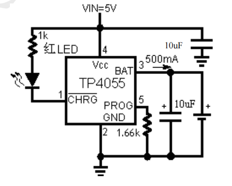 当输入电压(交流适配器或 USB 电源)被拿掉时,TP4055 自动进入一个低电流状态,电池漏电流在 2uA 以下。TP4055 的其他特点包括充电电流监控器、欠压闭锁、自动再充电和一个用于指示充电结束和输入电压接入的状态引脚。