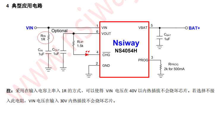 NS4054H 内置有防反接电路模块,在电池反接 时不会损坏芯片。