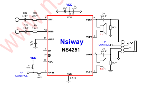 产品名称:NS4251 3.0Wx2 双声道 AB/D 类双模音频功率放大器附加耳机模式