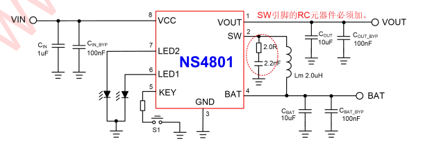 产片介绍: 是一款集成降压转换器、锂电池充电管理和电池状态显示的多功能电源管理IC,能够为便携式锂电池充电提供完整的解决方案。芯片的高度集成度和内置多重功能,使其在应用时仅需极少的外围器件,并有效的减小PCB寸,降低方案的成本。NS4801 只需要一个电感即可实现降压和升压功能。