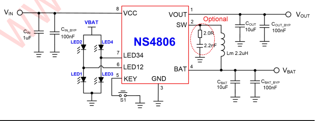 NS4806 是一款集成降压转换器、锂电池充电管理和电池状态显示的多功能电源管理 IC,能够为便携式锂电池充电提供完整的解决方案。芯片的高度集成度和内置多重功能,使其在应用时仅需极少的外围器件,并有效的减小 PCB 尺寸,降低方案的成本。NS4806 只需要一个电感即可实现降压和升压功能。其转换器工作频率为 1MHz,能够支持低成本的电感和电容。