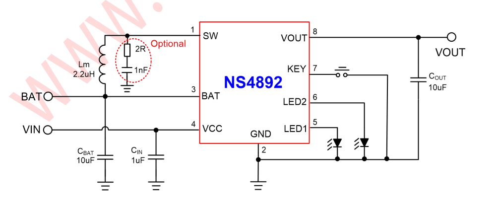 NS4892 是一款集成降压转换器、锂电池充电管理和电池状态显示的多功能电源管理IC,能够为便携式锂电池充电提供完整的解决方案。芯片内置多重保护功能,使其在应用时仅需极少的外围器件,即可有效的减小 PCB 尺寸,降低方案的成本。