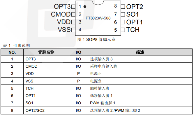 PT8023W 是一款电容式触摸控制 ASIC,支持单通道触摸输入和双路 PWM 输出,可引脚配置 6 种功能。PT8023W 主要应用于触摸调光 LED 灯具,具有低功耗、高抗干扰、宽工作电压范围、灯光无频闪、外围器件少的突出优势。