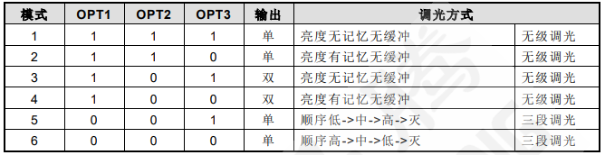 ● 共有六种功能可选,由 OPT1/OPT2/OPT3 管脚上电前的输入状态来决定。芯片管脚有