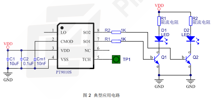 产片介绍:PT9010S 是一款电容式触摸控制 ASIC,支持单通道触摸输入和双路 PWM 输出,主要应用于触摸调光 LED 灯具,具有低功耗、高抗干扰、宽工作电压范围、灯光无频闪、外围器件少的突出优势。