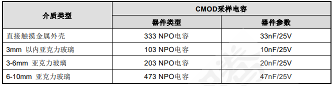 注意:当介质材料及厚度等差异较大时,可通过调整 CMOD 与 GND 之间的 Cm 电容来调节触摸灵敏度。电容容值越大,灵敏度越高;电容容值越小,灵敏度越低。以下数据仅供参考,具体以实际为准。