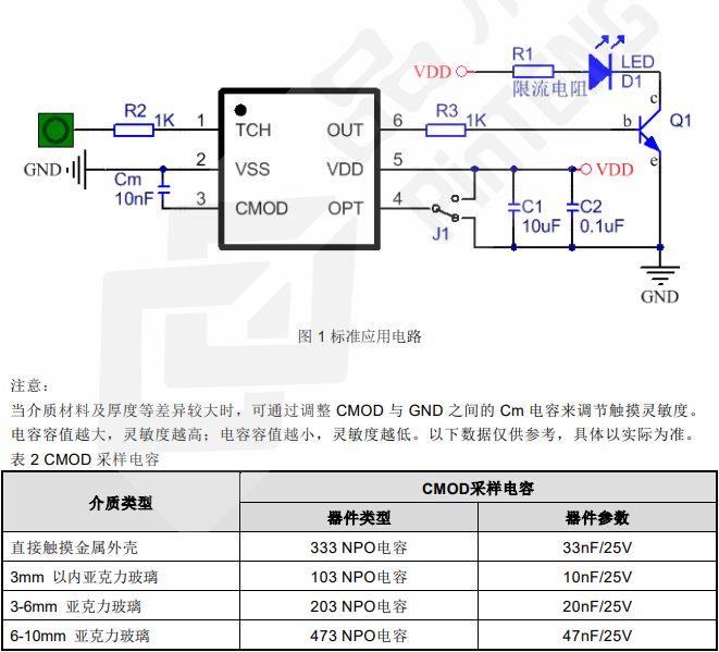 ● 因有物体覆盖触摸盘或环境突然变化,可能导致触摸检测持续有效。IC 内部触控算法检测到输出有效持续时间达到设定值 16S(±30%)时,系统会回到上电初始状态,且输出变为无效。
