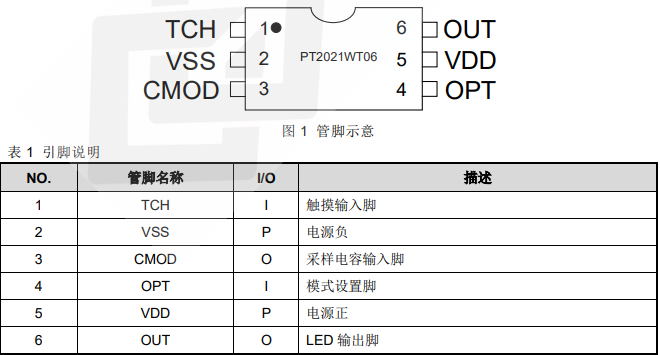 产片介绍:PT2021W 是一款电容式触摸控制 ASIC,支持一通道触摸输入,一通道三段 LED 输出,具有低功耗、高抗干扰、宽工作电压范围、高穿透力的突出优势。