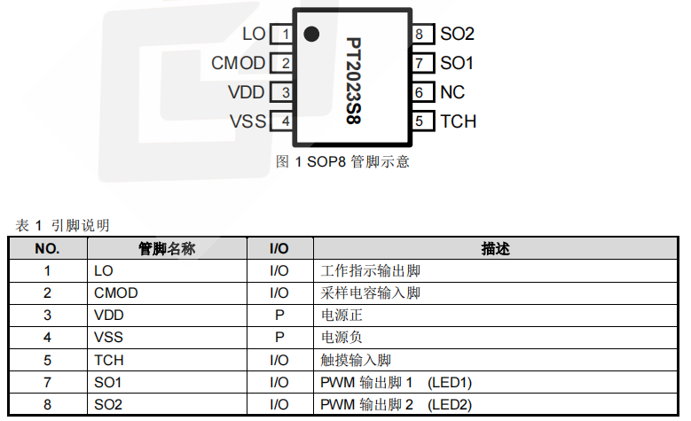 产品名称:PT2023 单触控双输出LED 调光调色温IC