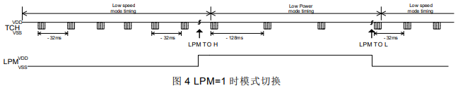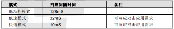 IC 在低速模式下运行,可实时响应双击触摸。在此模式下侦测到 LPM 拉高后会切换到低功耗模式,可节省功耗。在低功耗模式下侦测到 LPM 拉低后又可以切换到低速模式。