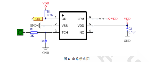 5) 可利用 Cs 电容调整灵敏度,Cs 电容值越小灵敏度越高,灵敏度调整必须根据实际应用的 PCB来做调整,Cs 电容值的范围为 1~50pF。