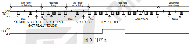 ● 按键唤醒后 8S 无触摸进入低功耗模式