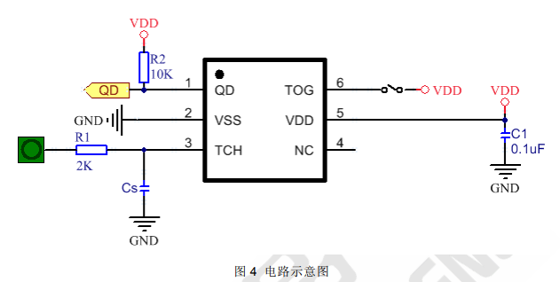 5) 可利用 Cs 电容调整灵敏度,Cs 电容值越小灵敏度越高,灵敏度调整必须根据实际应用的 PCB来做调整,Cs 电容值的范围为 1~50pF。