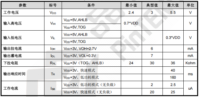 ● 待机工作电流:典型值 2uA@VDD=3V/无负载