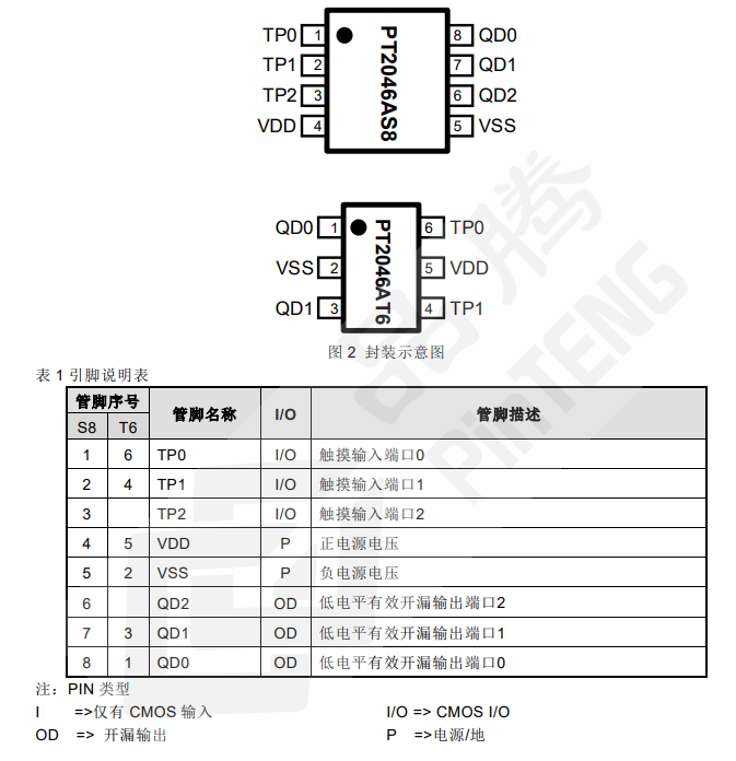 PT2046A 是一款 3 键触摸检测芯片。该芯片内建稳压电路,提供稳定电压给触摸感应电路使用,同时内部集成高效完善的触摸检测算法,使得芯片具有稳定的触摸检测效果。该芯片专为取代传统按键而设计,具有宽工作电压与低功耗的特性,可广泛地满足不同消费类应用的需求。