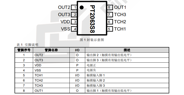 产片介绍:PT2063 是一款电容式触摸控制 ASIC,支持 3 通道触摸输入,3 通道触摸输出。具有低功耗、高抗干扰、宽工作电压范围的突出优势。