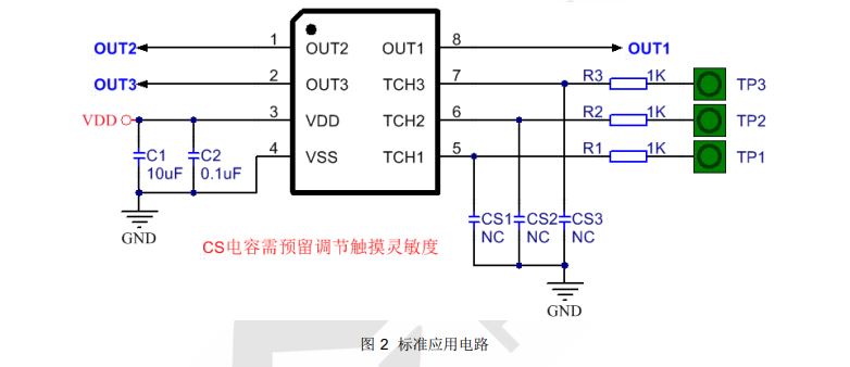 若其它条件固定不变,根据各键的实际情况调节 Cs 电容值使其达到最佳灵敏度,同时也使各键灵敏度达到一致。当 Cs 电容不接时灵敏度最高,Cs1~Cs3 的容值越大灵敏度越低,Cs 可调节范围为:1~20pF 一般取值 5 pF(触摸盘 10*10mm 介质厚度 3mm)