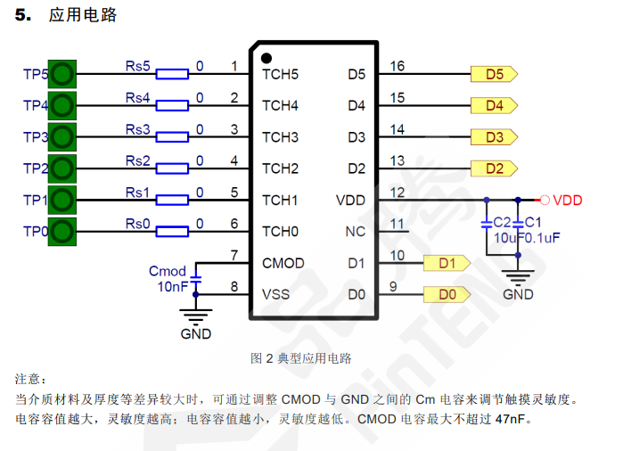 ● CMOD 脚外接电容可调节灵敏度,电容越大灵敏度越高